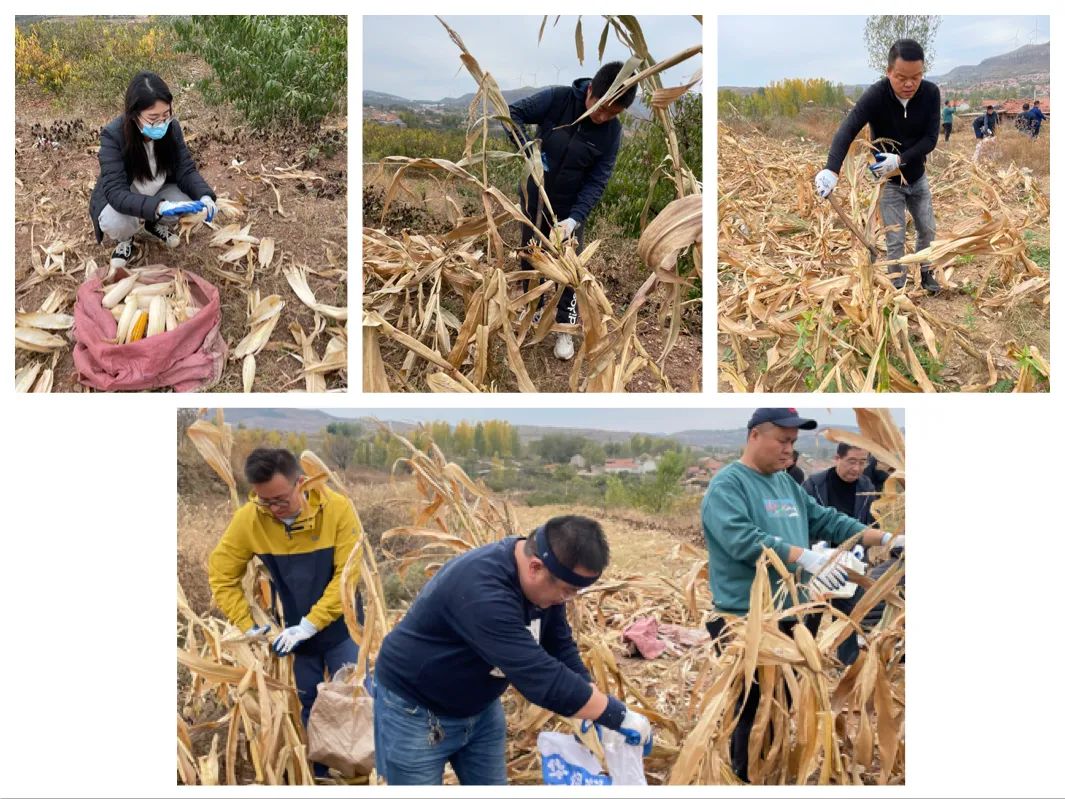 玉米地內(nèi),大家擼起袖子默契協(xié)作,有的采摘玉米,有的負(fù)責(zé)運送,有的負(fù)責(zé)砍玉米桿……處處都是大家忙碌的身影。經(jīng)過大半天的齊心協(xié)力,大家終于把玉米全部收完。